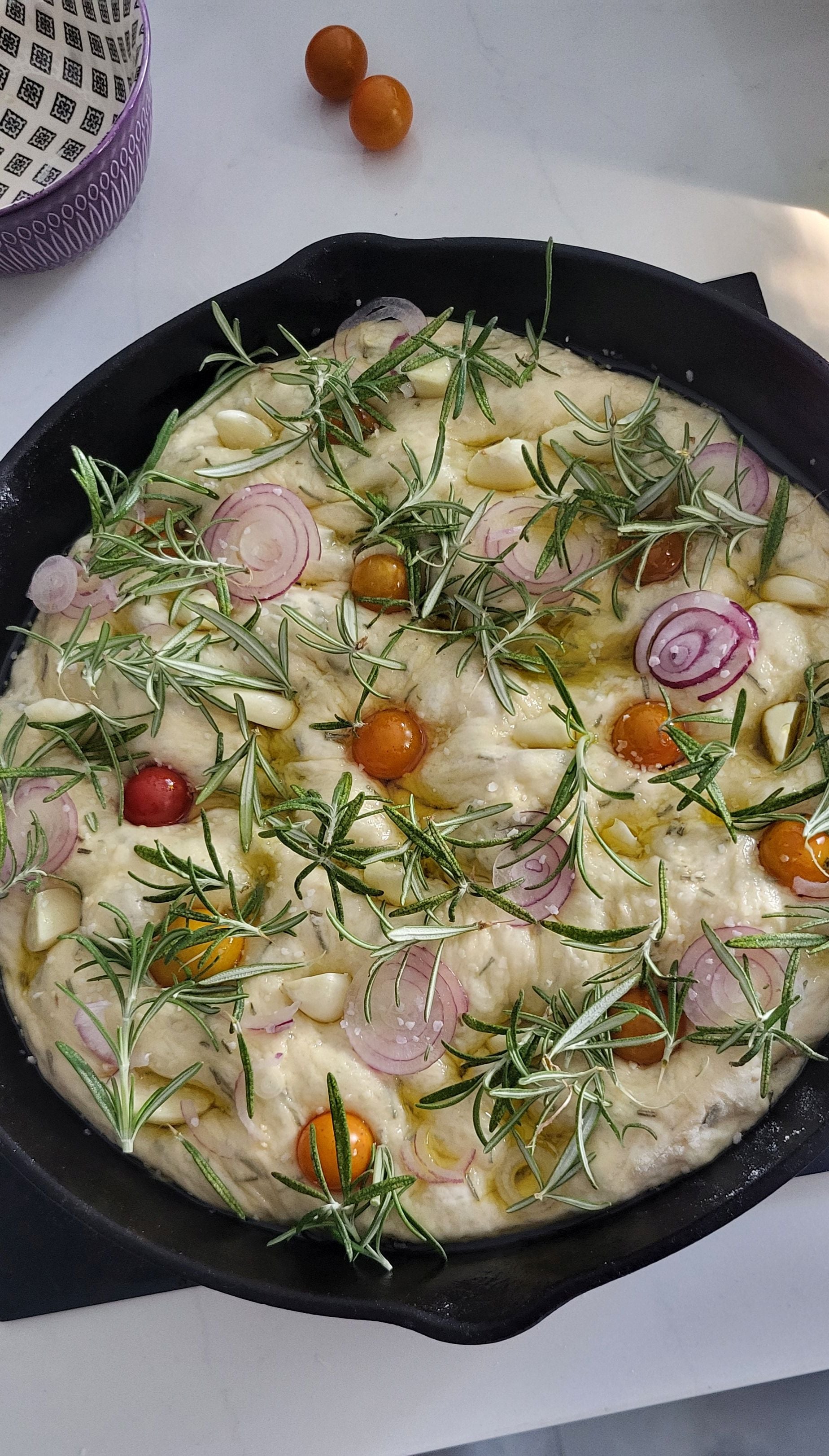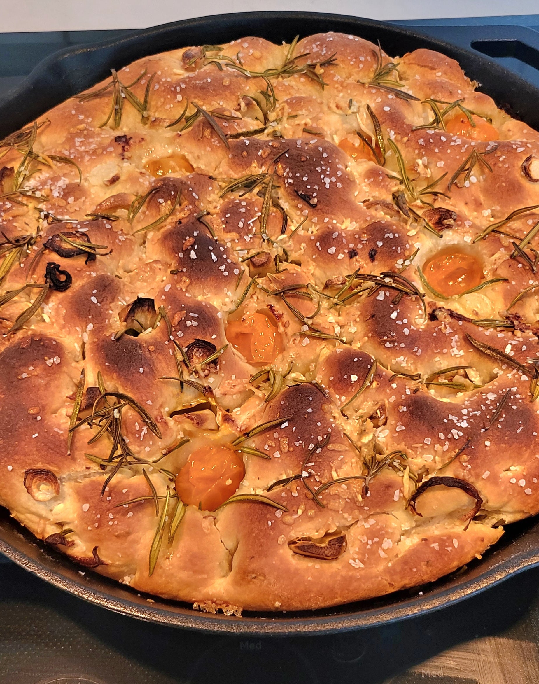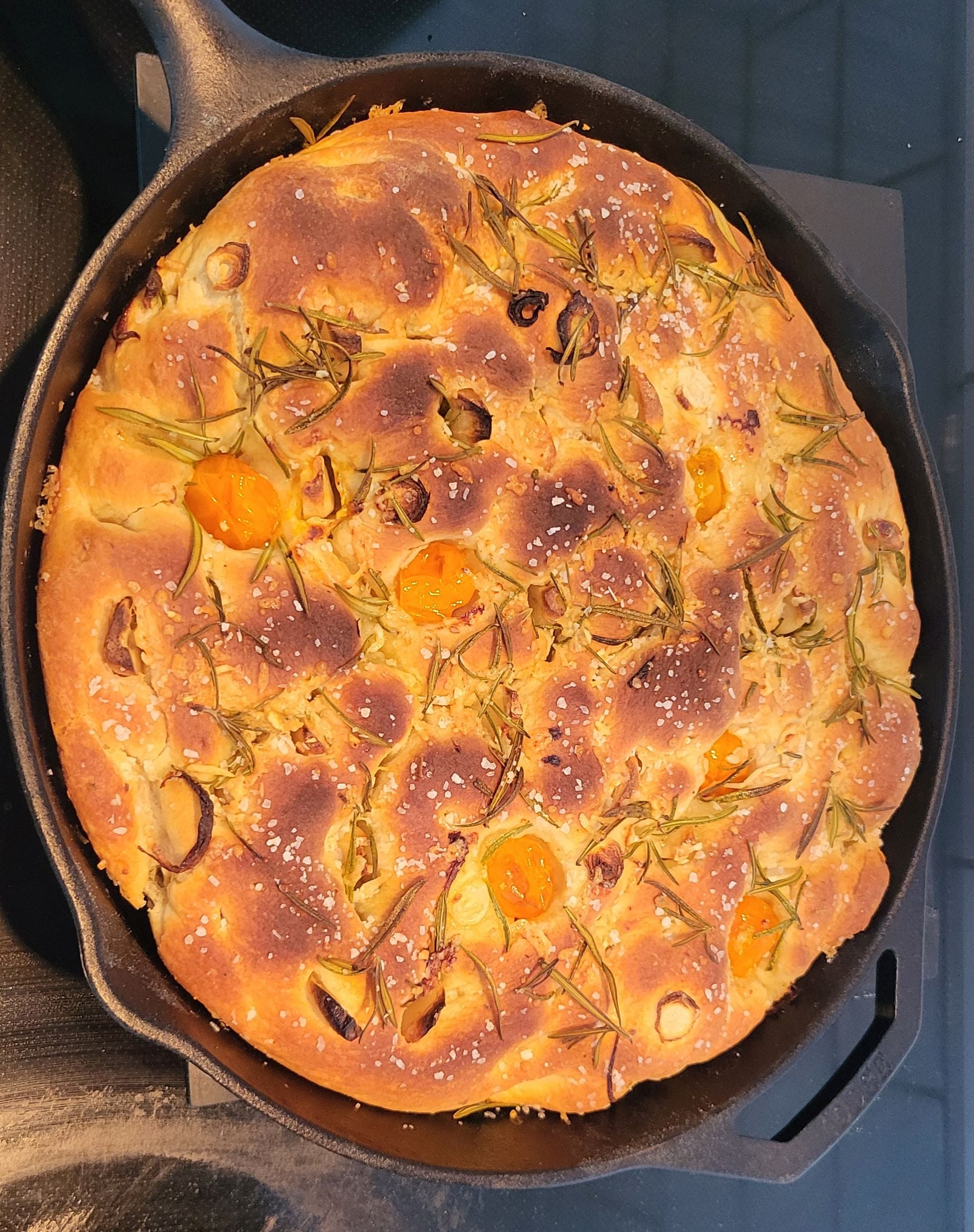 This bread machine focaccia recipe uses the dough cycle for easy preparation. After the dough is made, it rises twice—once on a floured surface and once in the cast iron pan coated with olive oil. The focaccia is flavored with rosemary, garlic, and sea salt and baked at 400°F for 20 to 25 minutes until golden. Feel free to add toppings like tomatoes, garlic, or onions before baking. Let it cool on a rack before serving.