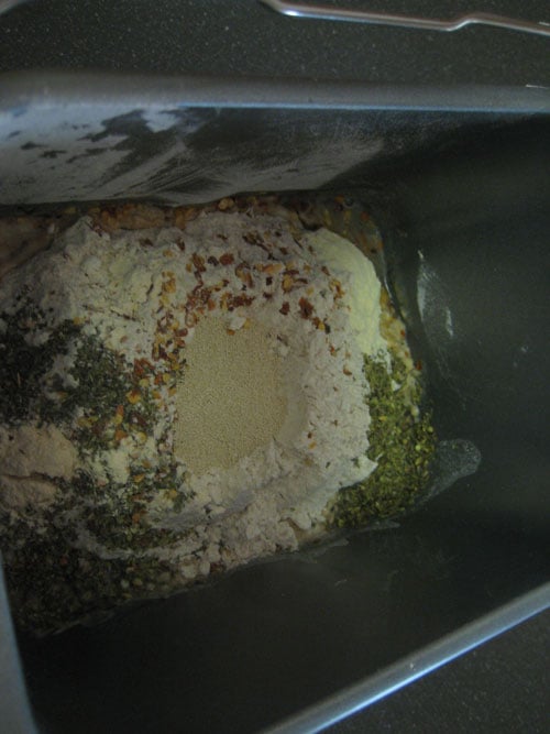 Herb Wheat Pizza Crust Feb 10 2009 Finished pizza dough Ingredients 1 1/4 c. warm water 1/4 tsp. salt 2 tbsp. sugar 2 c. all-purpose flour 1 c. whole wheat flour 2 tsp. active dry yeast 2 tsp. oregano 1 tsp. dried red pepper 2 tsp. garlic powder 1/2 tsp. basil Directions Add ingredients starting with wet going to dry In the flour, make a hole for the yeast to rest in You DO NOT want the yeast and water to touch Photos Pizza dough ingredients loaded in Finished pizza dough Stored pizza dough crust Categories breads & rollspizza