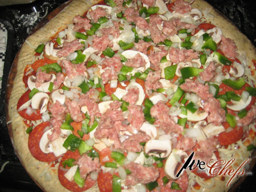 Turn your over on to 425 degrees and have the pizza stone in the oven while it’s warming up. Roll your pizza dough out, once you are done pull out the pizza stone and rub some oil on it. Place the crust on the stone and spread out pizza sauce. Add minced garlic and then the cheese. Put the rest on in this order: Pepperoni, Mushroom, Italian Sausage, Onion and Green pepper, Jalapenos and then the Olives. Sprinkle some Italian Seasoning and slide into the oven for about 15 minutes or until cheese is bubbly.